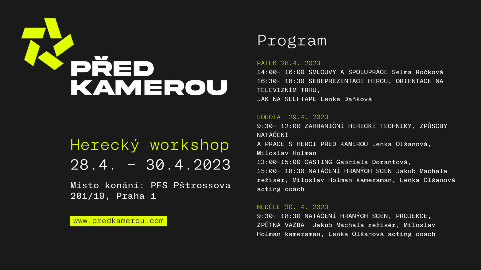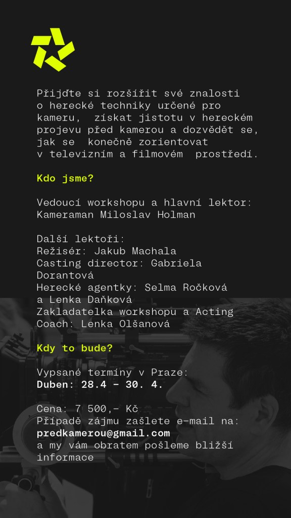 Na konci dubna proběhne další herecký workshop Před Kamerou. Naše studenty odborně provede cestou seriálového/filmového herce šest profesionálů z oboru od sebeprezentace, jednání ohledně smluv, herecké přípravy na roli, castingu až po samotné natáčení s hodnotnou zpětnou vazbou. Zde najdete detailní program. Pro přihlášení a dotazy pište na predkamerou@gmail.com